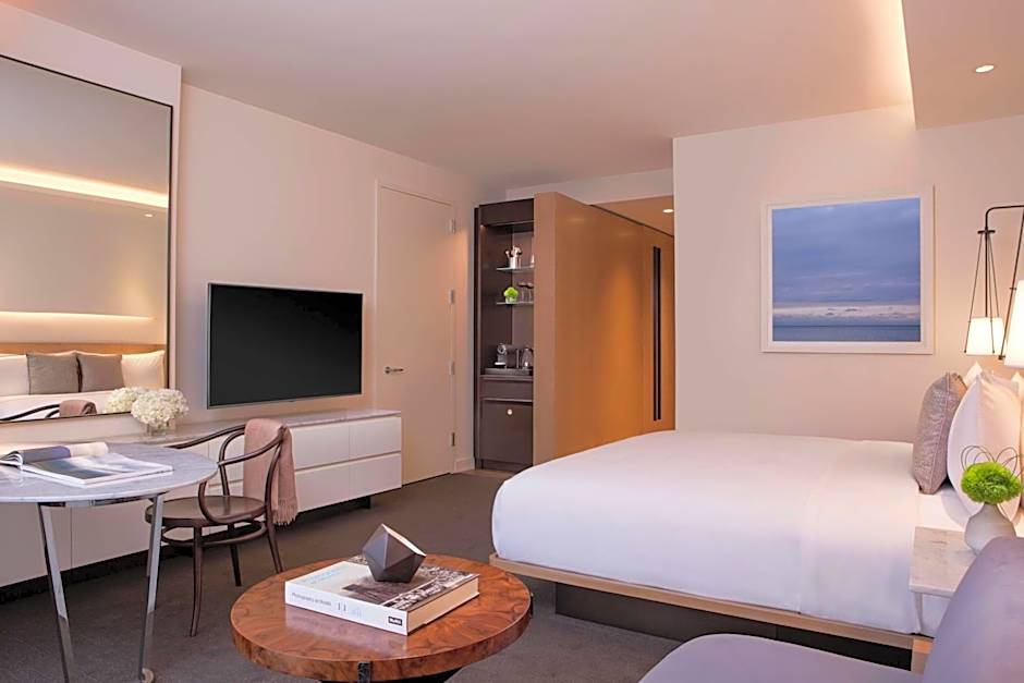 This room features floor to ceiling windows with panoramic views. The bathroom features double vanities, a walk-in shower with a rain shower head, and a choice of Shanghai Tang, Temple Spa, or Refinery amenities.